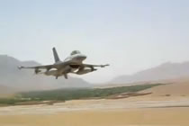 fighter jet buzzes past a group of soldiers less than 20 feet off the ground.